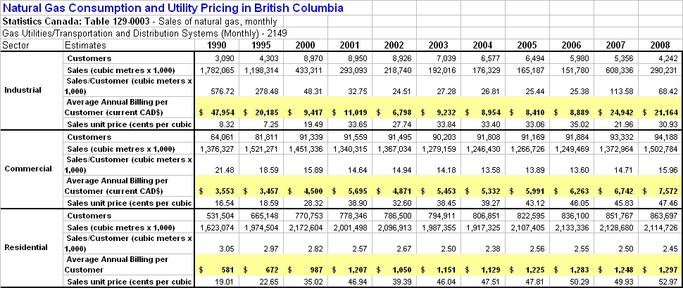 Therefore, the promise that consumer prices per unit of energy used will decline as per customer demand declines is unlikely to be realized. Since 1979, it has not been realized in any developed western nation. The history of natural gas demand and pricing in BC, as outlined in the table below, is not unique in this regard. We see the same pattern in all provinces and EU member nations, for natural gas, electricity and (to a lesser extent) home heating fuel.