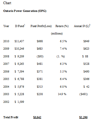 From 2003 to the year-end in 2010, OPG’s earnings after payments in lieu of taxes (PIL) were $2,295 million (see Chart). OPG, for many years, has been required to set aside money for the decommissioning of their nuclear plants and for the disposal of nuclear waste and this “fund” as of March 31, 2011 contained $11,437 million.  Without the earnings from this fund since 2003 OPG’s earnings would have been miserable. The fund since 2002 has returned (on average) 6.5% which provided earning of $3,042 million or about $750 million more than OPG’s after tax earnings.