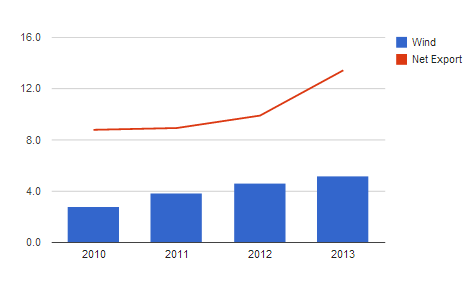 imageNB: The chart above shows wind generation growth versus net export growth in terawatts.